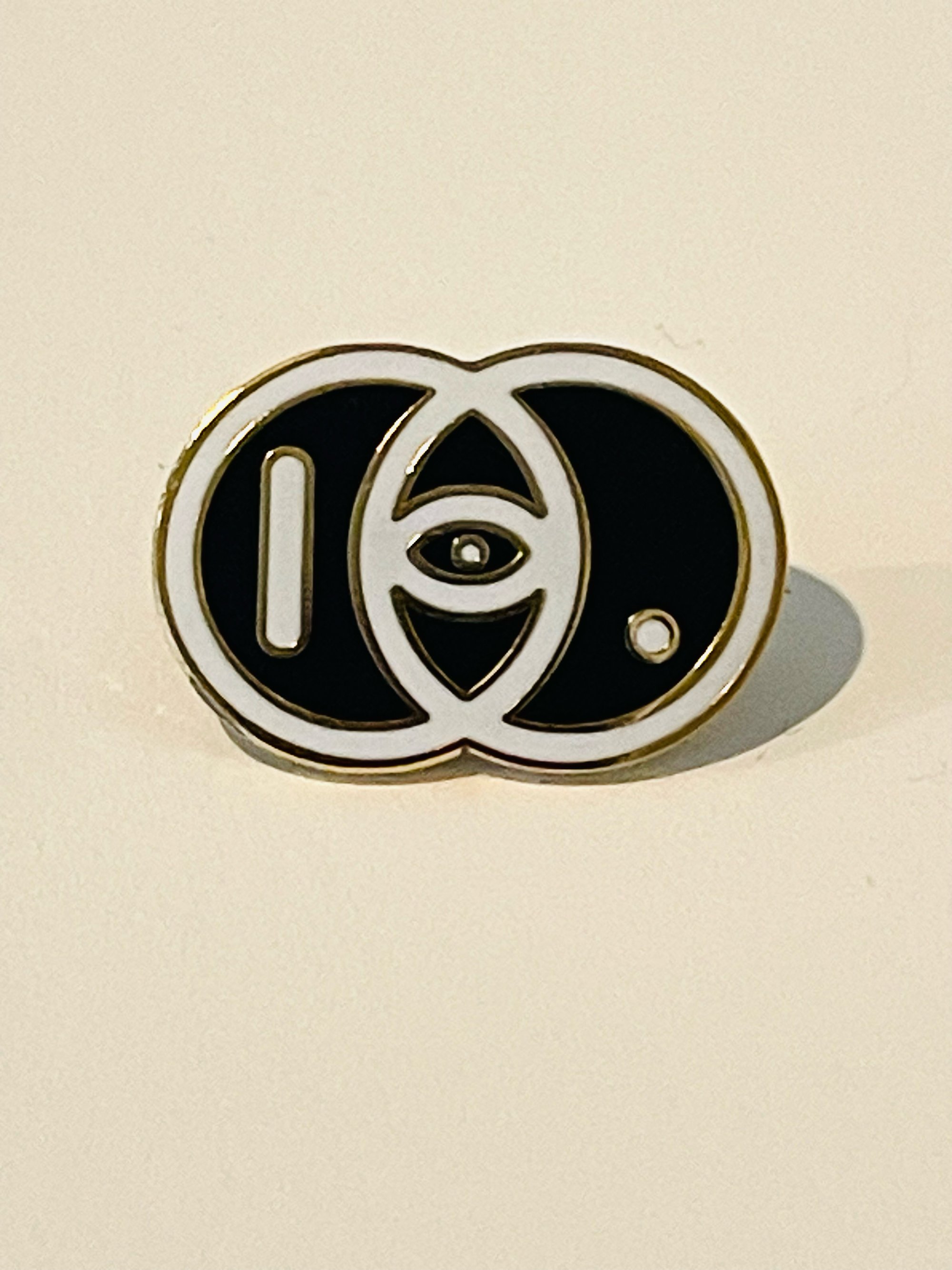 One of the original logo designs used by iDKHOW, as an enamel pin.